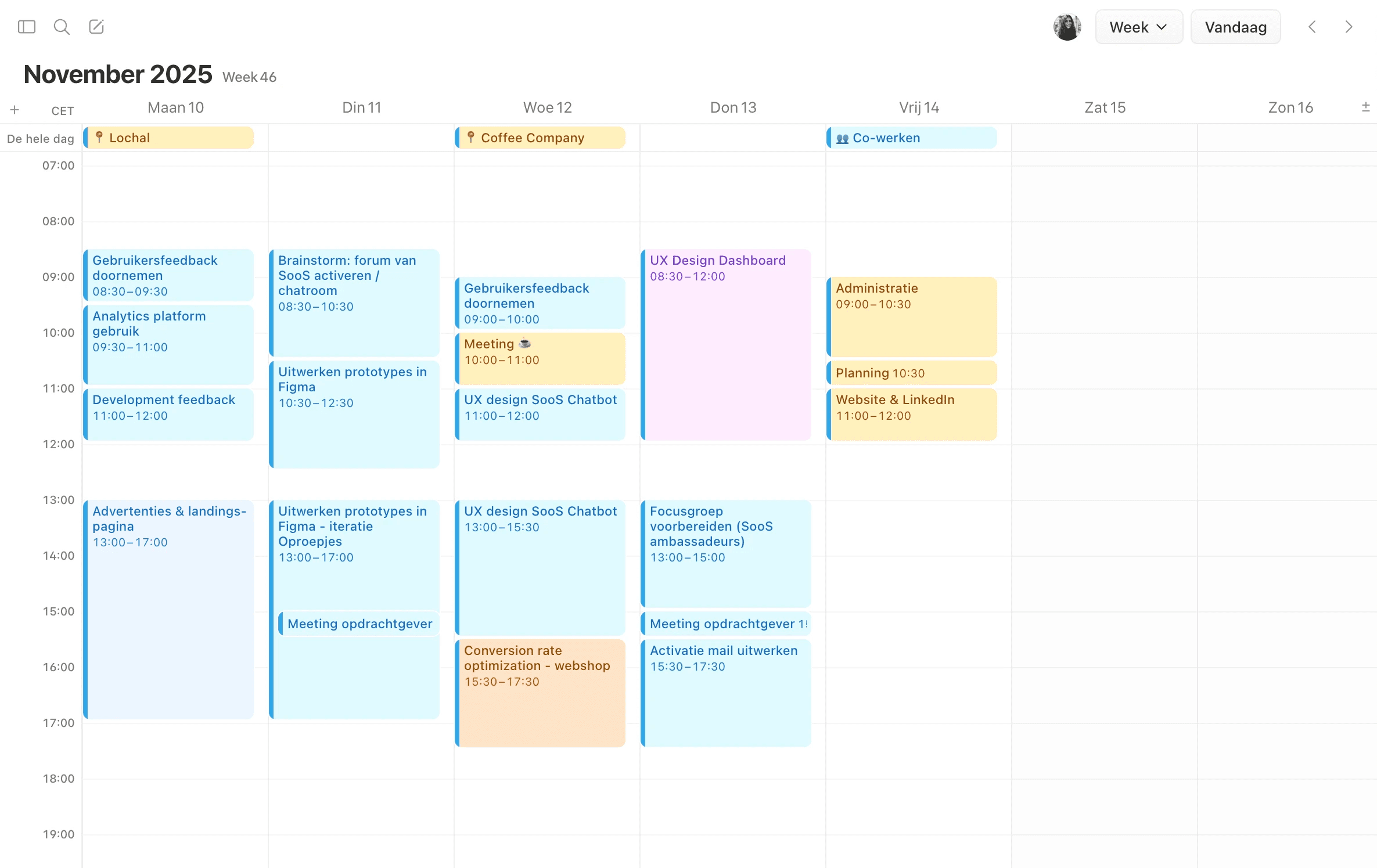 Na een jaar in loondienst merkte ik dat ik graag zelfstandig wilde werken. Daarom werk ik nu een jaar als freelance UX designer en marketeer. Ik werk veel vanuit mijn werkkamer thuis, maar ik probeer ook een aantal keer per week een dagdeel buiten de deur te werken. Bijvoorbeeld in de Lochal, de Coffee Company of Bagels & Beans in het centrum van Tilburg. Elke week werk ik voor een aantal verschillende opdrachtgevers. Ik werk voornamelijk aan doorlopende projecten. Zo ziet een gemiddelde week er nu uit voor mij: